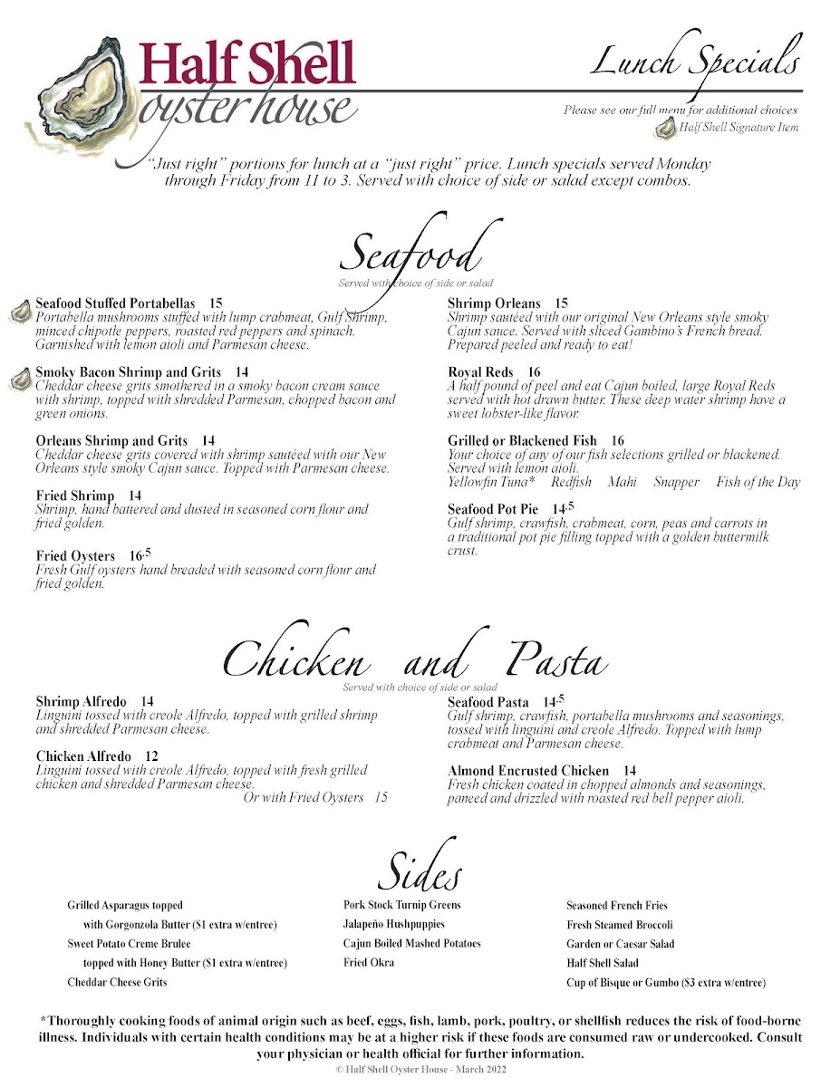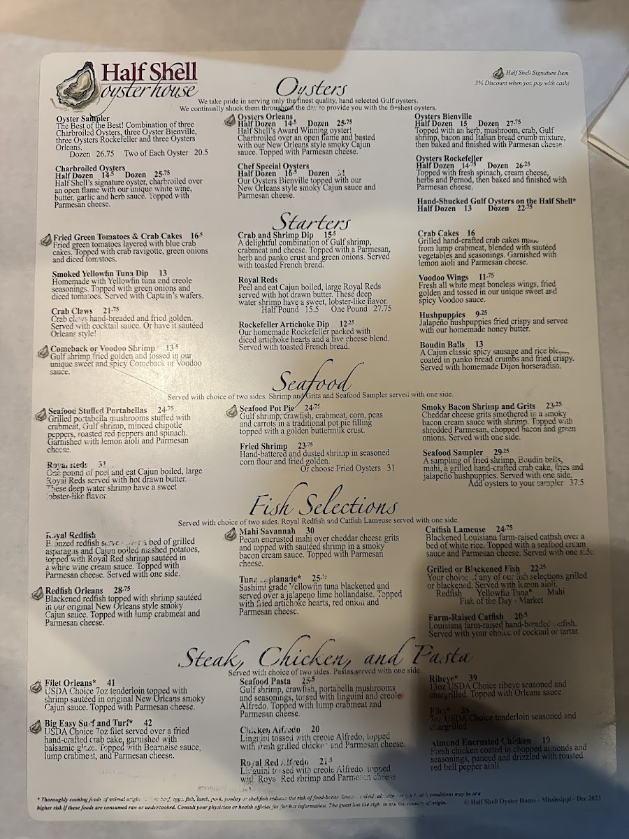 Welcome to Half Shell Oyster House - Flowood, where New Orleans charm meets the freshest flavors of the Gulf. Located in Flowood, MS, this vibrant eatery offers a menu that showcases exquisite seafood and hearty steaks. Dive into their famed Smoky Bacon Shrimp and Grits, featuring succulent Gulf shrimp atop cheddar cheese grit cakes, all enveloped in a smoky bacon cream sauce. For oyster lovers, try the hand-breaded Fried Oysters or indulge in a dozen charbroiled varieties, delivered fresh from the coast. Aside from seafood, the menu shines with perfectly chargrilled meats like the tender 13 oz Ribeye and Big Easy Surf and Turf, bringing a coastal twist to classic steak dishes. With savory flavors and a warm atmosphere, each meal feels like a celebration. Diners rave about the quality and ambiance, reassured by the delightful experiences that await at Half Shell. Join for a taste of the Gulf, and you'll agree—it's truly a culinary gem.